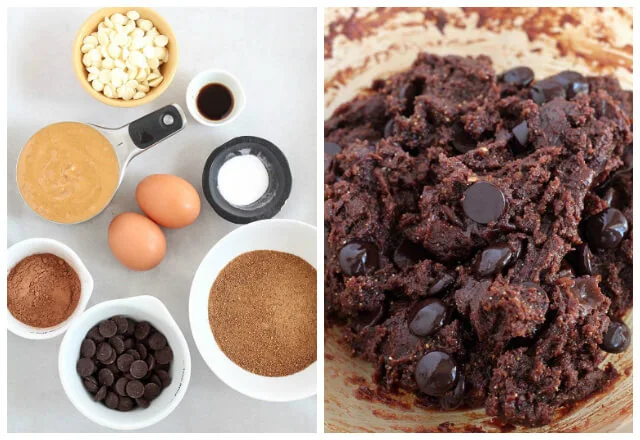 - Meanwhile, crack the eggs into a mixing bowl and whisk to combine with a fork. Add the sugar and stir a few times until it turns liquidy. Mix in the vanilla extract and peanut butter. Add the cocoa powder & baking soda and stir until the mixture is combined (it will be quite thick by now). Fold in the chocolate chips with a spatula or fork.